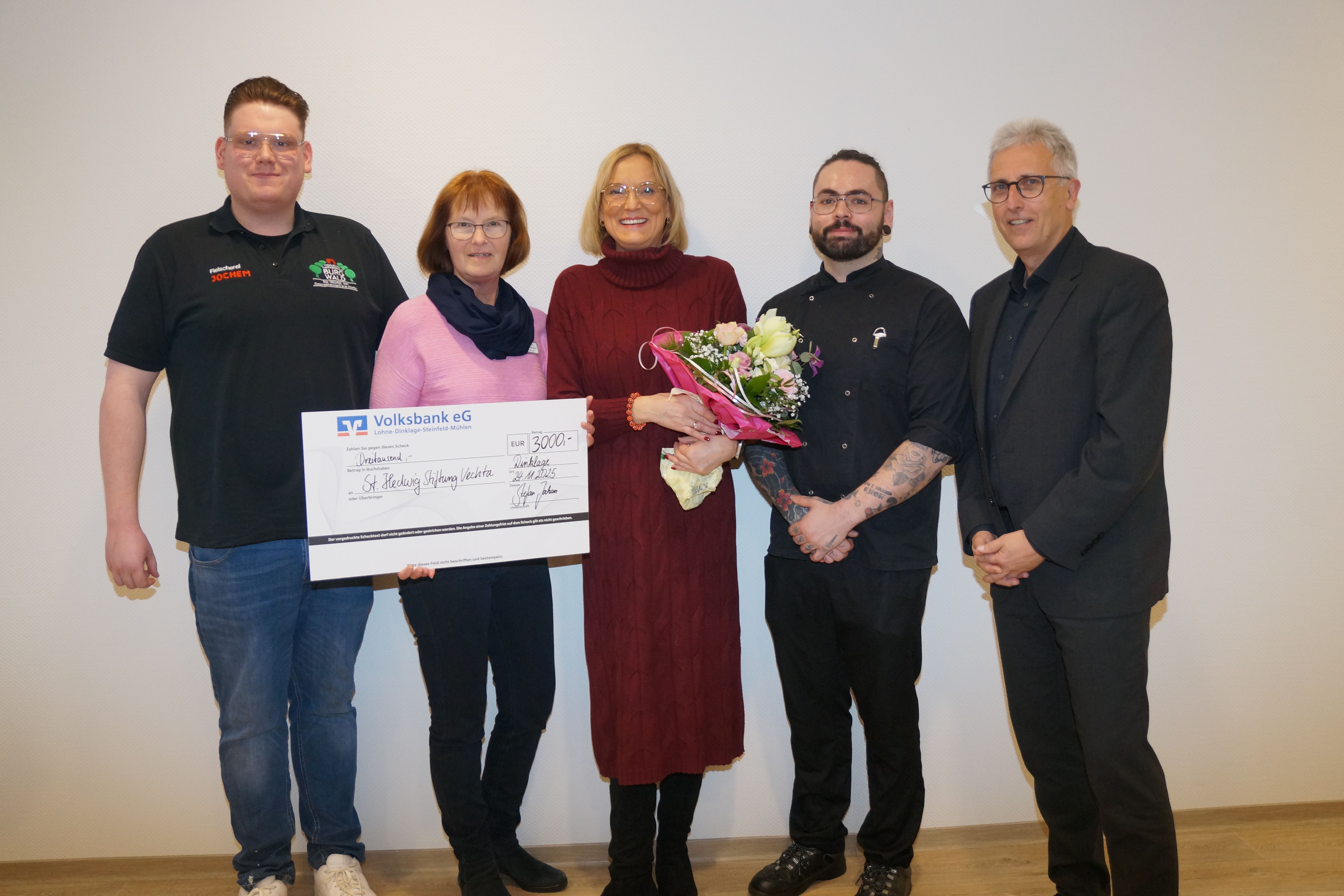 Über einen Spendenscheck in Höhe von 3.000 Euro konnten sich Ende November die Mitarbeitenden der Wirtschaftsdienst GmbH der St. Hedwig-Stiftung freuen. Der Scheck wurde von der Firma Burgwald-Frischdienst Fleisch- & Wurstspezialitäten GmbH aus Dinklage überreicht. Wie in jedem Jahr verzichtet das Unternehmen auf die üblichen Werbepräsente zu Weihnachten und unterstützt stattdessen Organisationen durch eine Spende. Für die St. Hedwig-Stiftung nahmen Hildegard Eckelmann, Leiterin der Zentralküche, und Stiftungsvorstand Peter Schulze den Scheck in Empfang. Von dem Geld soll ein mobiler Buffetwagen für warme und kalte Speisen angeschafft werden, der bei Veranstaltungen mit den Bewohnern, z. B. für Salate beim Grillen oder als Kuchentheke genutzt werden kann.